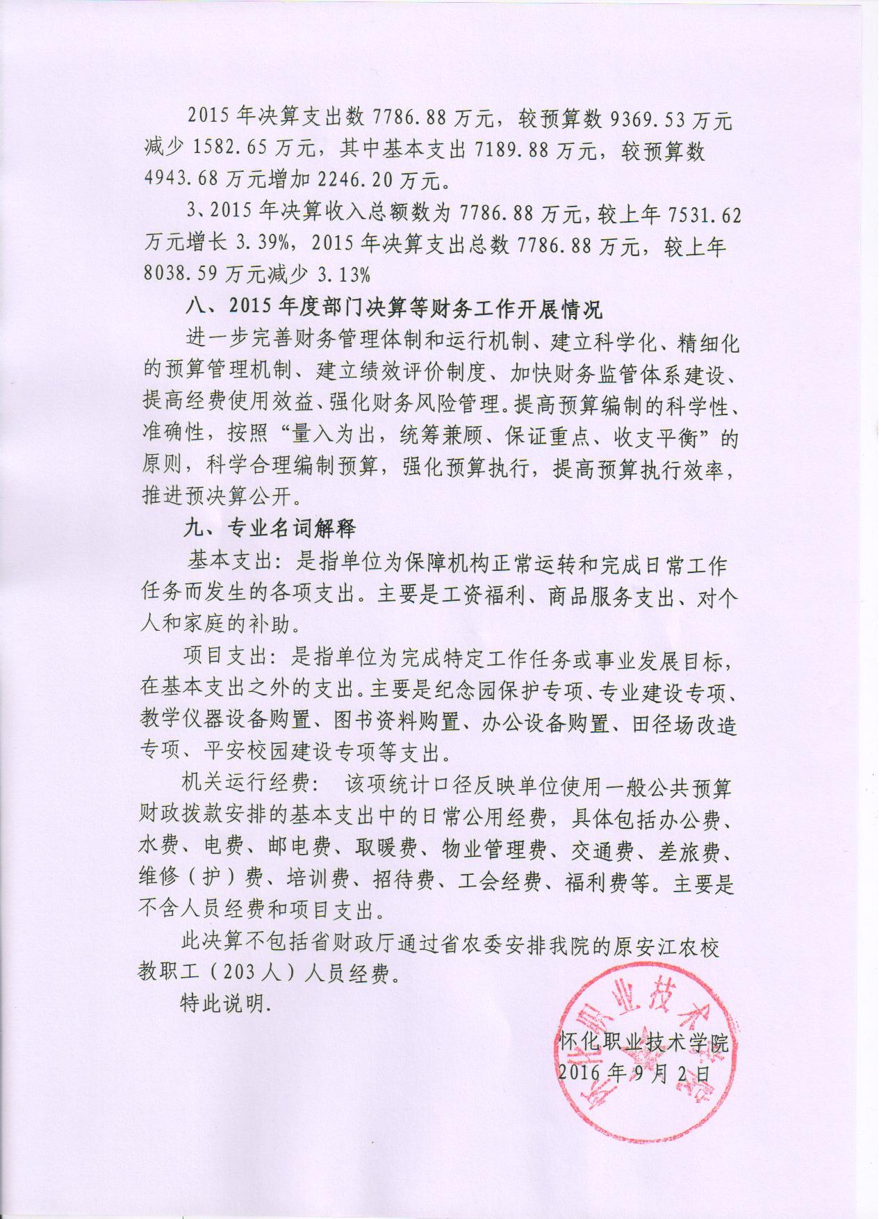 怀化职业技术学院2015年度部门决算公开说明
